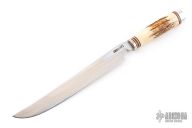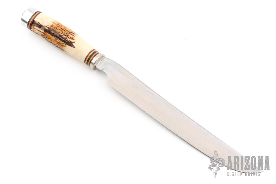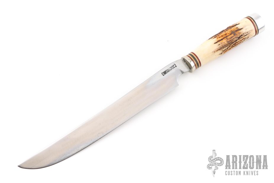 This Vintage Model 6-9 Carver by Randall Made Knives features a satin finished blade with .158" blade stock and 1.100" blade depth, hidden tang construction. The handle has a nickel silver guard, stag grip with red/white/blue spacers and a duralumin butt. Has some light scratches, otherwise excellent condition.