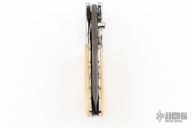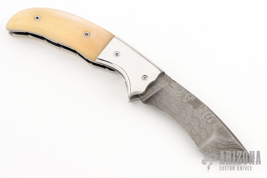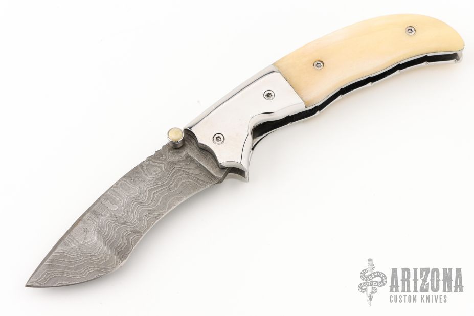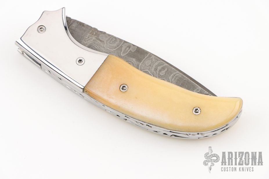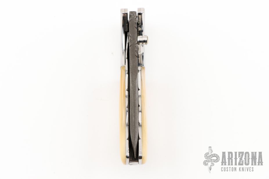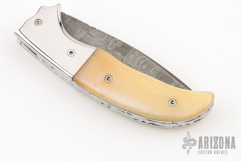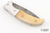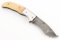 This knife by Master of Knife features a Damascus blade with a single thumbstud with bone inlay and fileworked blade spine. The handle has stainless steel bolsters, bone scales, fileworked stainless steel liners and backspacer. Nice lockup. Has a couple very light scratches, otherwise excellent condition.