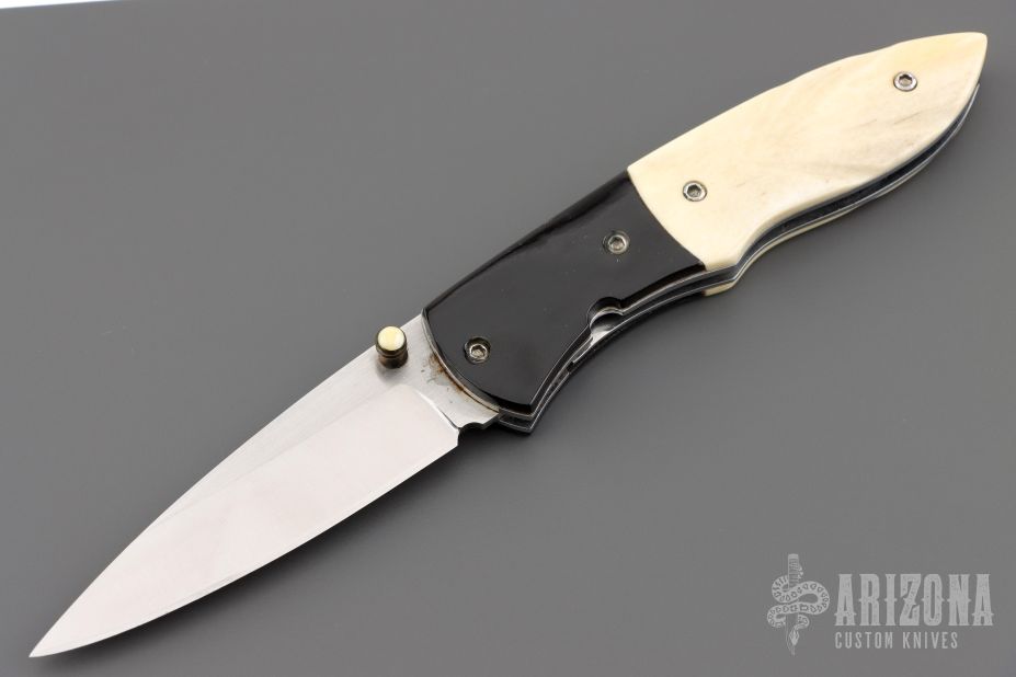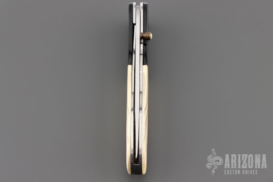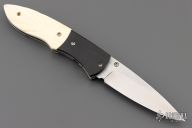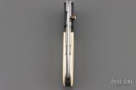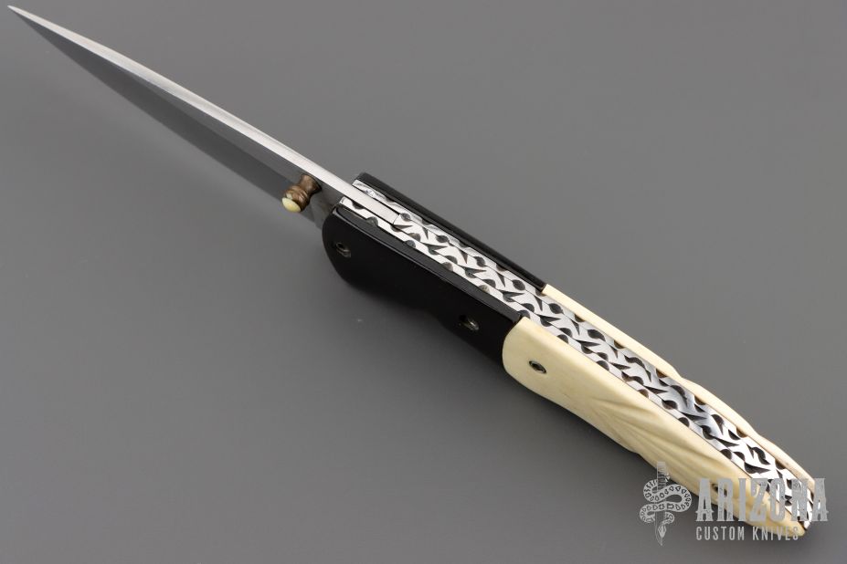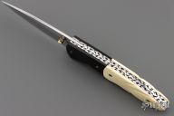 This knife by Master of Knife features a satin finished blade with a single brass thumbstud with bone inlay. The handle has buffalo horn bolsters, carved bone scales, fileworked stainless steel liners and backspacer. Nice detent, blade seating and lockup. Has a couple very light scratches, otherwise excellent condition.
