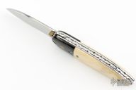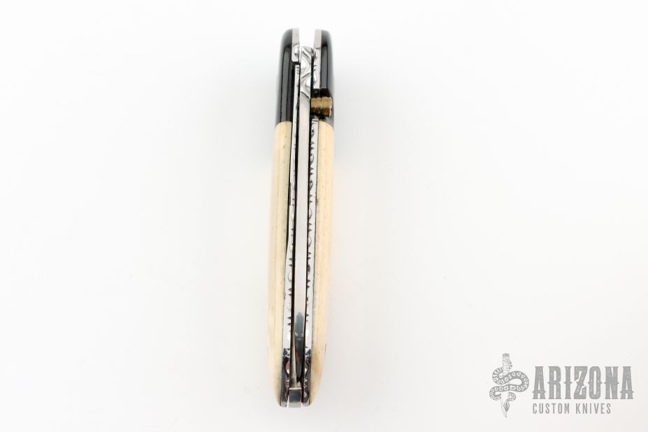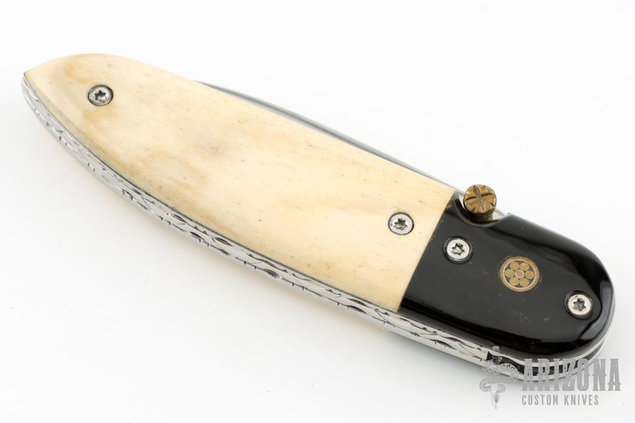 This knife by Master of Knife features a mirror finished blade with a single brass thumbstud with fileworked spine. The handle has buffalo horn bolsters, bone scales, fileworked stainless steel liners and backspacer. Nice detent, blade seating and lockup. Has a couple very light scratches, otherwise excellent condition.