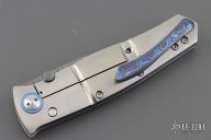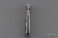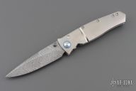 This Dr. Death by Tom Mayo and Jeremy Marsh features a Damasteel spear point blade with false top edge and dual two-tone anodized titanium thumbstuds. The handle has a satin and orange peel finished titanium frame, ZircuTi backspacer and tip up clip with hidden screws. Rides on bearings, nice detent, lockup and blade seating. Comes with a velcro case. New condition. Originally from 2024 NOCKI.