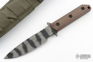 In 1988, he began making specialized knives for use by the military. This turned out to be fortunate turn of events, both for Mick and for the knife using world at large. Mick’s approach was to not get burdened by the weight of past designs. He started with a tabula rasa, a clean slate, informed only by his own experiences and knowledge of what a soldier needed in a knife. The knives he made didn’t look like the hunter-inspired knives seen in most PXs; instead they were almost brutish in their functionality: beefy, solid, and with unbreakable ¼” stock full tangs. These knives were the first indication of his innovative approach: in addition to their utilitarian design, the knives carried a subdued finish and subdued sheaths. No one carrying a Strider knife was going to be spotted because of sunlight glinting off of polished steel or a glossy leather sheath. Soldiers, policemen, and other men going into harm’s way couldn’t buy them fast enough. Mick sampled some good ideas, but made them great. For instance, he was not the first to wrap a knife handle with paracord, but he was the first to do it in a way that was tough enough for sustained infantry use. His knife line grew over the following years to include different varieties of fixed blades, all distinctive and many with specialized uses. But constant in all of them was a disregard for convention, and a desire to try new ideas. An example of this was the Ajax – it featured a very wide blade surface clearly designed to inflict damage. It drew on the weapons carried by Roman legionnaires, yet was modern and usable in the 21stCentury battlefield. Mick also worked on his technical skills, always striving to become better at the physical craft. At the 2002 Blade Show, a group of the best tactical knifemakers in the country decided to compete with each other to produce the most innovative and interesting fixed “battle blade” at the show. Mick’s entry, an incredible integral knife made out of ½” titanium stock with a zippered composite blade, gorgeous handles, and integral guard was the unanimous winner, and effectively retired the competition.
