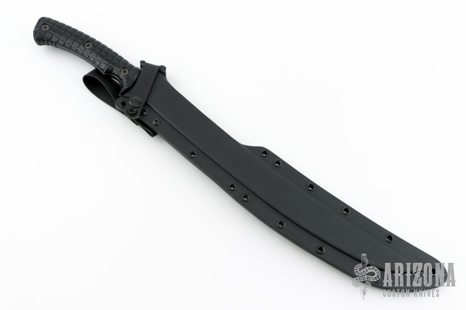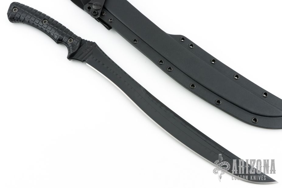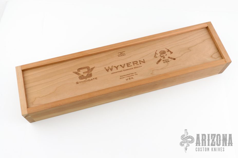 This Wyvern by RMJ Tactical features a black coated and textured blade with milled fullers, false top edge, notched thumbrest, .207" blade stock and 1.644" blade depth, full tang construction. The handle has frag pattern black G-10 scales. Comes with a kydex sheath with high ride MOC straps and low ride MOC straps. Comes with original box, card, patch, coin and papers. Excellent condition.