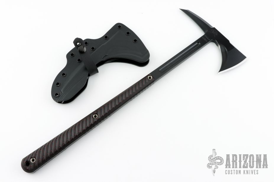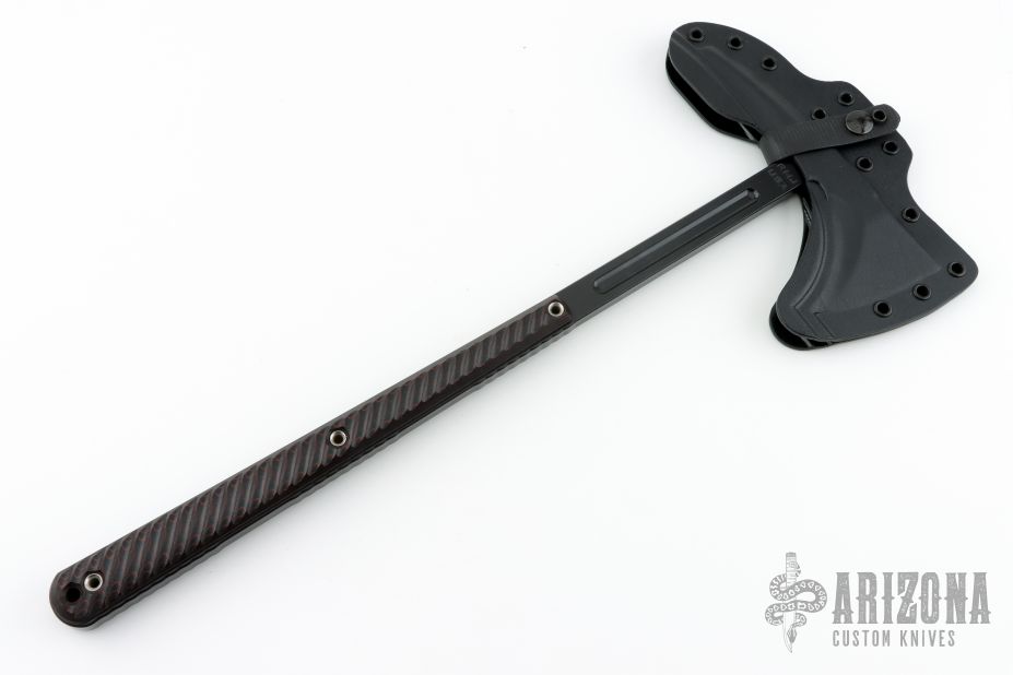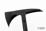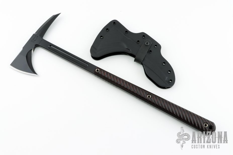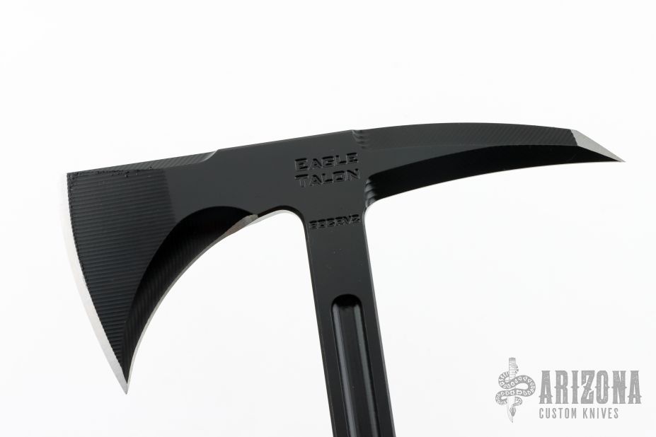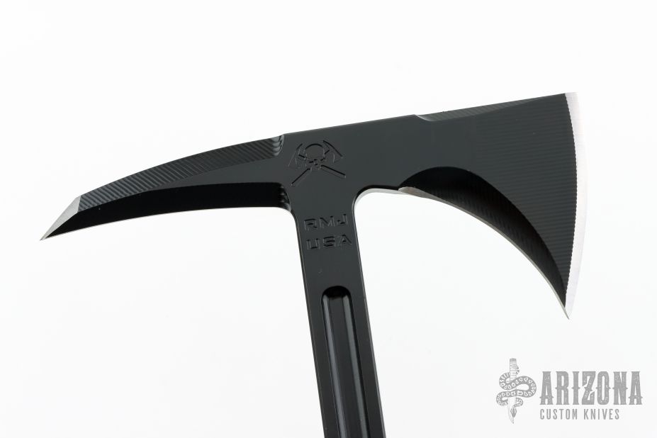 The Eagle Talon is the tomahawk that started it all. It was the first all-steel integral designed tomahawk and has been the keystone for all other RMJ tomahawks. It was inspired by 18th Century French and Indian War tomahawks that our designer, Ryan, had been emulating for many years. In the Spring of 2001, Ryan was commissioned by members of the USAF 820th Security Forces to design a tomahawk that featured 18th century lines and 21st century engineering; a tomahawk for modern combat use. Work began, and by the fall of 2001 the Eagle Talon Special Forces Tomahawk was being used in Afghanistan. Why a Tactical Tomahawk? The tomahawk has served as an effective field tool and weapon for over 300 years, and the physics behind the tomahawk design give it many advantages over a knife. The user can choke up on the grip to use the tomahawk like a more traditional knife, or when held in a normal grip, the cutting power and strike force is multiplied several times over due to the leverage created by the length of the handle. Great for: Breach | Utility | Emergency / Safety Tool | Preparedness Kit Specifications Overall Length: 7 in Overall Height: 18 in Forward Cutting Edge Length: 2.875 in Blade Thickness: .400 in Weight: 1 pound 15 ounces (without sheath) Blade Material: 80CRV2 Carbon Steel (HRC 57-58) Sheath: Molded kydex sheath and Low-Ride M.O.C. straps. Excellent condition. Comes with original box and papers.