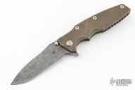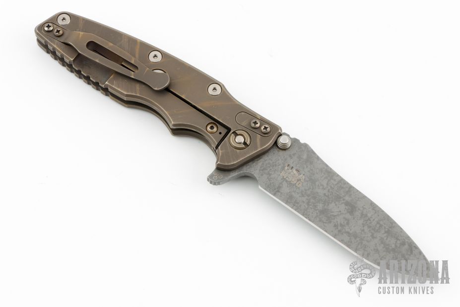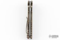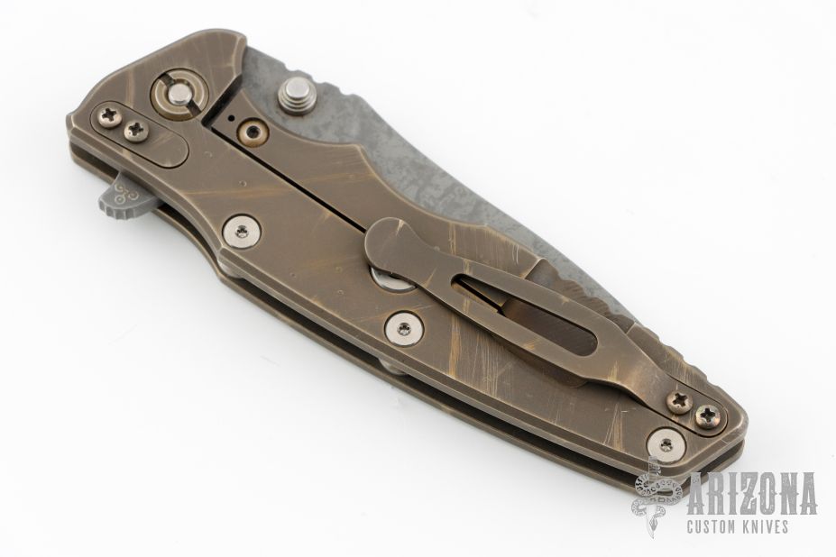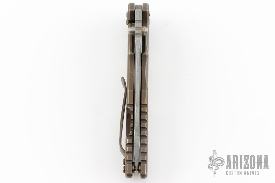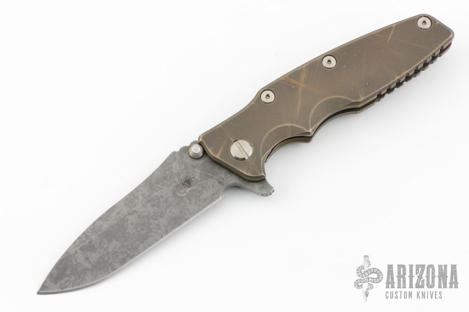 This Eklipse by Rick Hinderer features an Aftermarket battle field pickup finished blade with notched thumbrest and flipper. The handle has an Aftermarket bronze battle field pickup finished titanium frame satin hardware, and a tip up or down reversible stonewashed and anodized titanium clip and filler tab, lanyard hole at the butt. Excellent condition. Comes with original box and extra pivot hardware.