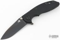 This 3" XM-18 flipper from Hinderer Knives has a black DLC blade with notched thumbrest and flipper, no choil. Black G-10 scale and a black DLC stonewash finished titanium frame and pocket clip. Reversible pocket clip. Strong lock up, nice detent and blade seating is center. Includes original box, extra bushings and papers. Excellent condition.