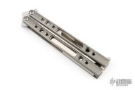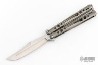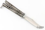 This balisong by Shawn Greacen features a satin finished blade with swedge. The handles are tumble finished titanium with titanium spacers and T-latch. Excellent condition. Comes with a zippered case.