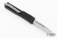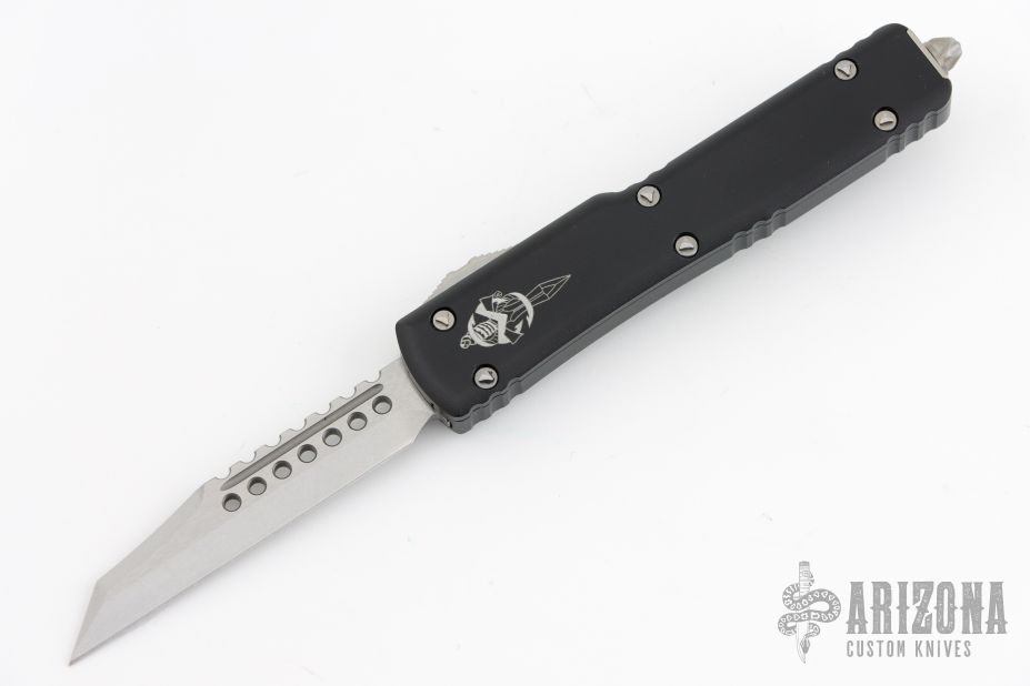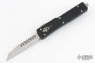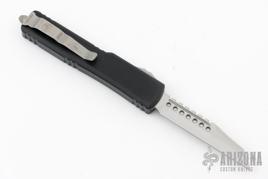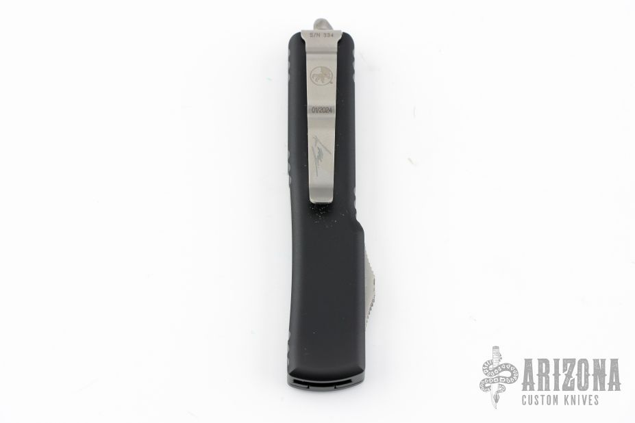 This Signature Series UTX-70 OTF automatic by Microtech features a stonewashed Warhound blade. The handle has a black aluminum frame with blasted stainless steel tip down clip. Dated 01/2024 and s/n 334. Comes with original box and papers. Excellent condition.