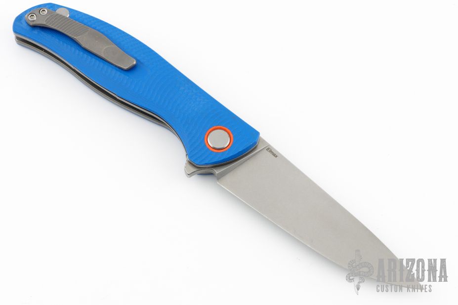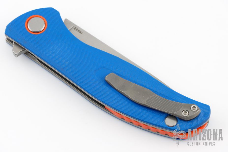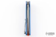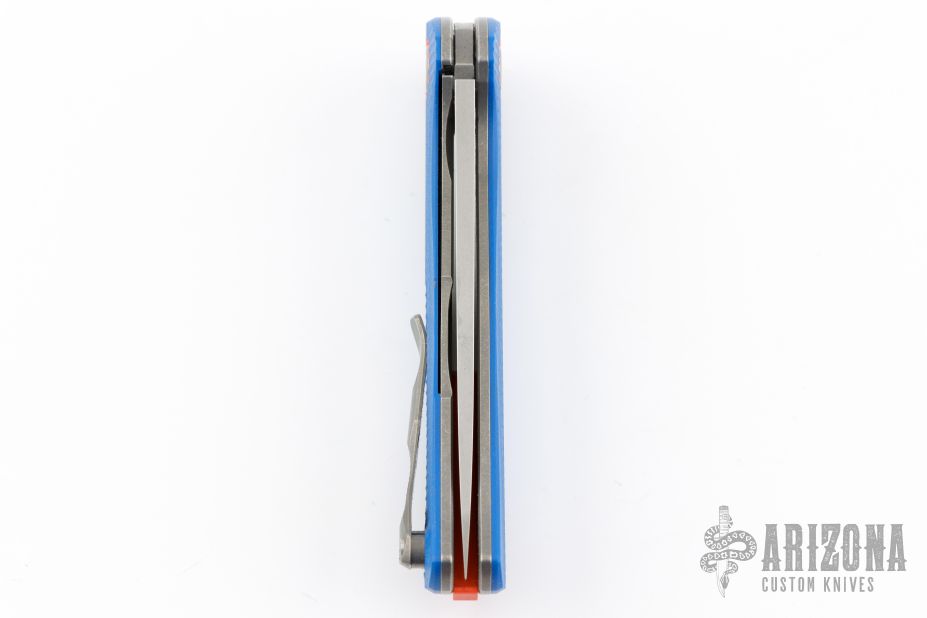 This F3 Flipper from Shirogorov has a flat ground spear point blade with notched thumb rest and flipper. Handle has blue G-10 scales with orange G-10 pivot collars and backspacer, with titanium tip up clip and stonewashed titanium liners. Has recessed lanyard bail. Dead center blade seating, excellent detent and lockup, and flips superbly on single row bearings. Excellent condition. Includes original box and papers. Excellent condition.