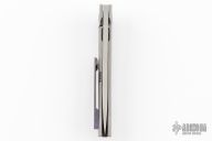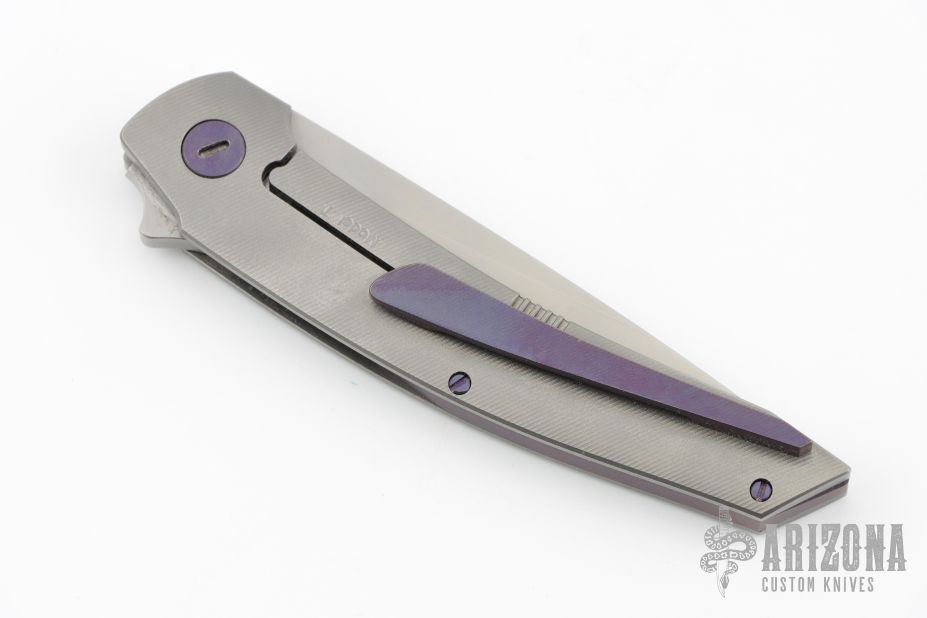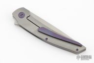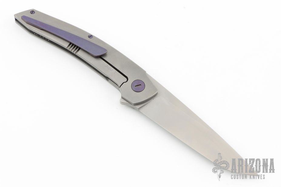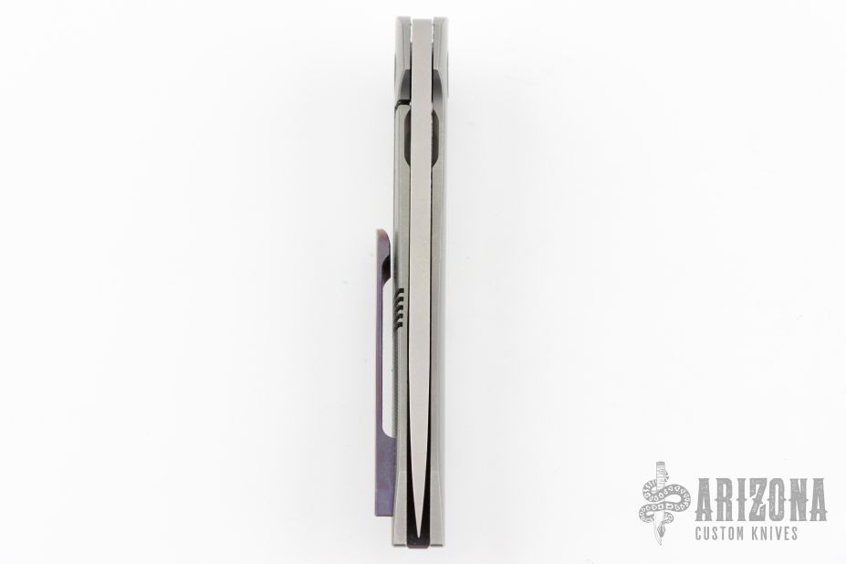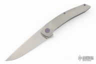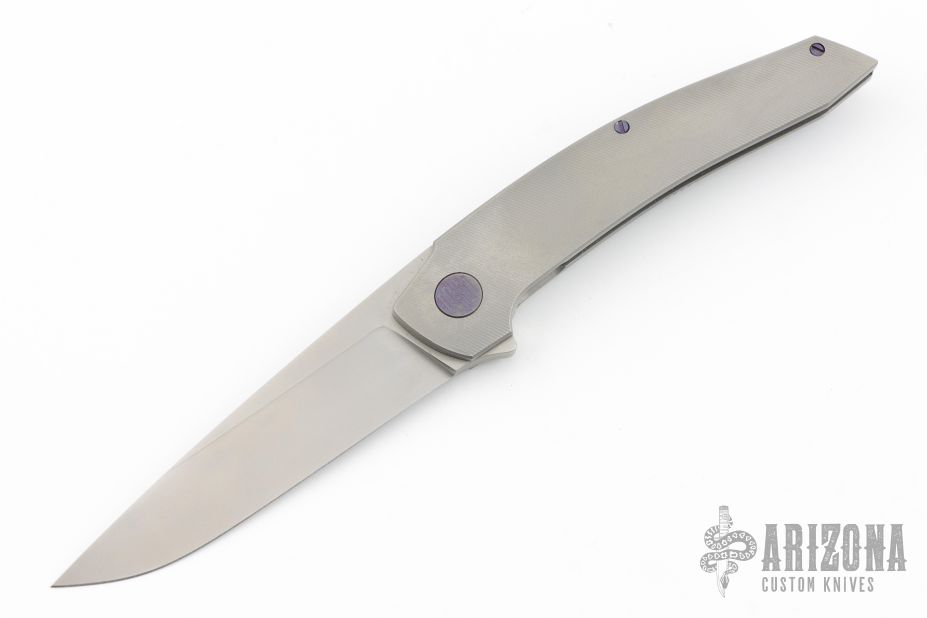 This Model T by Hog House Knives features a milled and bead blasted blade with flipper. The handle has a milled and blasted titanium frame with anodized hardware and tip up clip. Nice detent, lockup and blade seating. Comes with original box and COA. Dated 9/2022 and #065. Has some light scuffs, otherwise excellent condition.