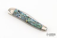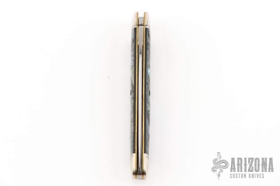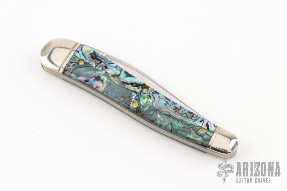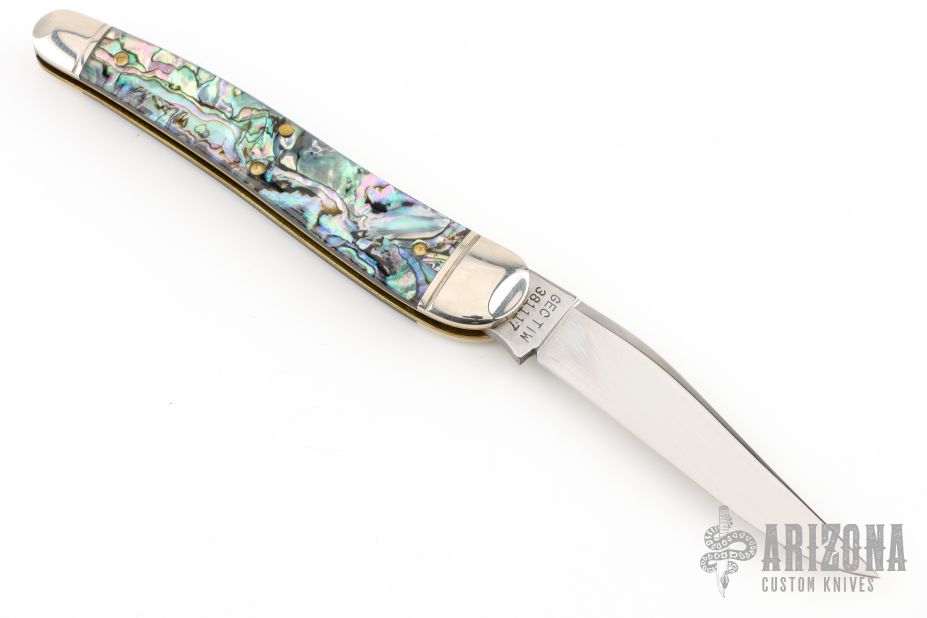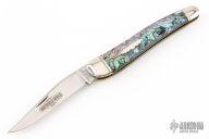 This Whittler by Great Eastern Cutlery features a satin finished blade with nail nick. The handle has nickel silver bolsters and brass liners, Green Abalone covers. Comes with original packaging. Excellent condition.