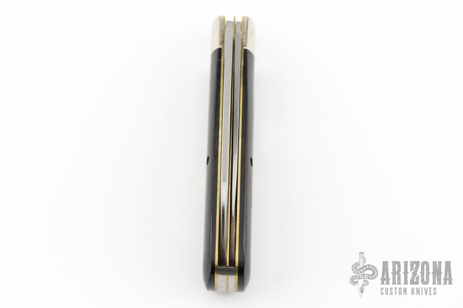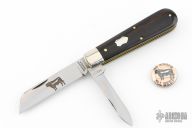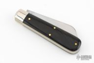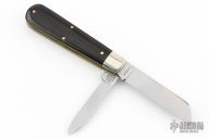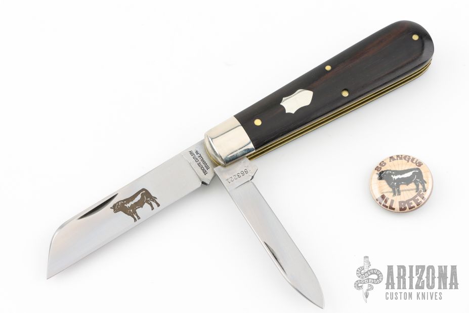 This Angus Jack by Great Eastern Cutlery features two satin finished blades with nail nicks. The handle has nickel silver bolsters, Macassar Ebony covers, brass liners and steel springs. Has half-stops. Comes with original packaging. Excellent condition. 512 made.