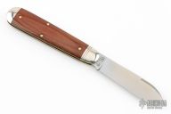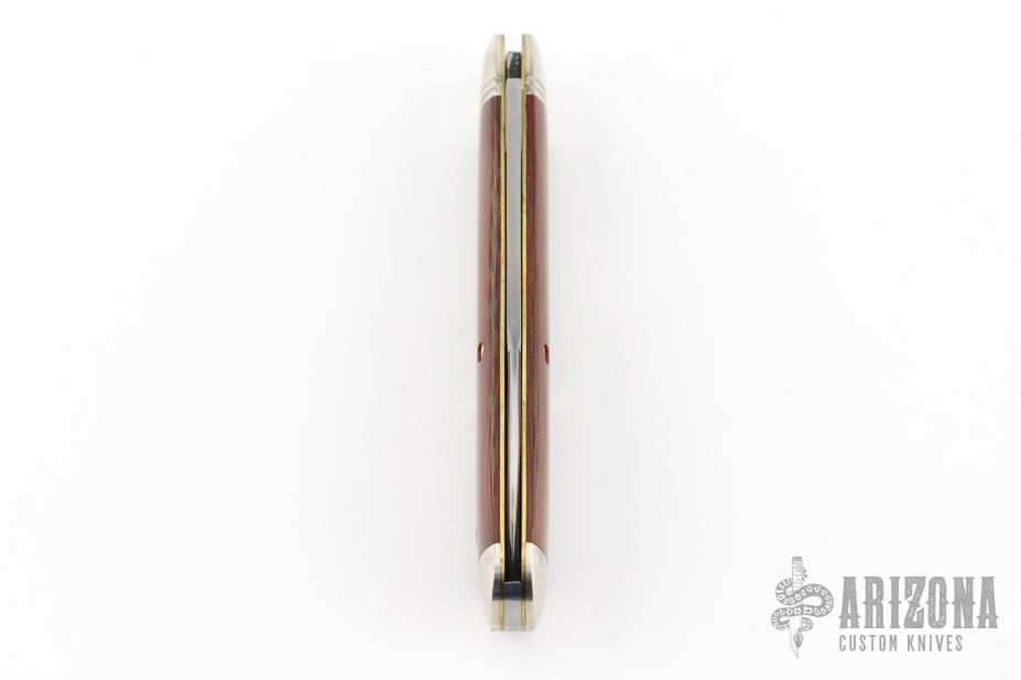 This American Jack by Great Eastern Cutlery features a satin finished blade with nick and swedge. The handle has nickel silver bolsters and butt, natural linen micarta covers with brass liners, and a stainless steel spring. Has half-stop, flush in the open and closed positions. Comes with original tube. Excellent condition.