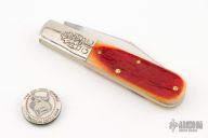 This Barlow from Great Eastern Cutlery features a satin finished clip point style blade with swedge. The handle has pinched and fluted nickel silver bolsters, rust orange natural bone covers over brass liners and stainless steel spring. Has Half-stop. Comes with original tube. Excellent condition.