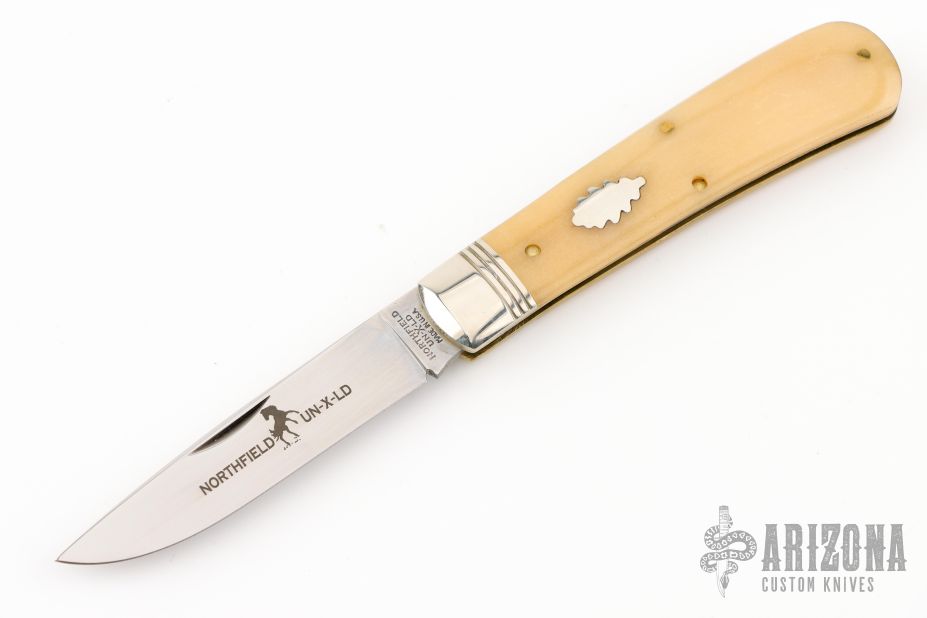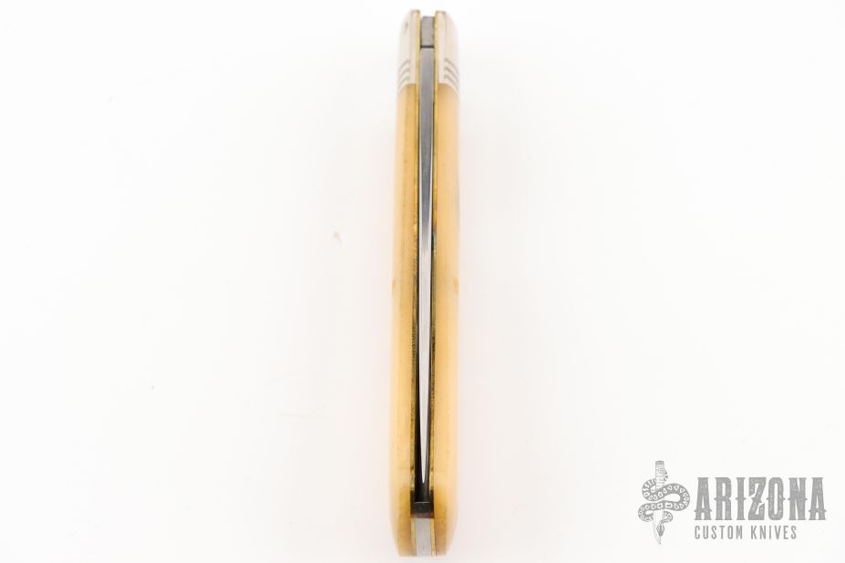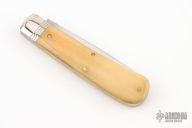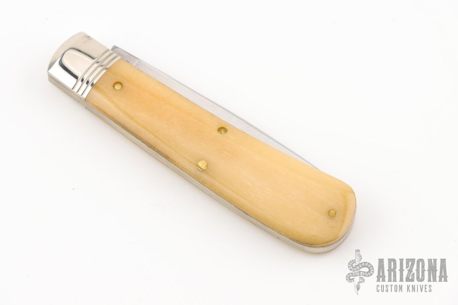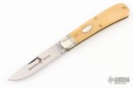 This knife by Great Eastern Cutlery features a satin finished blade with nail nick. The handle has nickel silver bolsters that are pinched and fluted, nickel silver escutcheon, brass liners, smooth oiled bone covers. Has half-stop. Comes with original tube. Excellent condition.