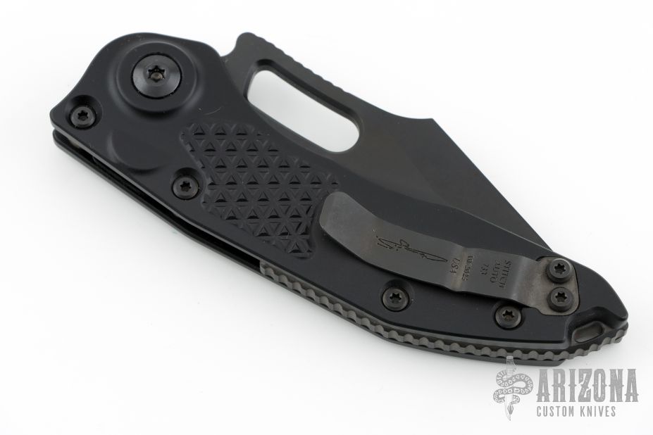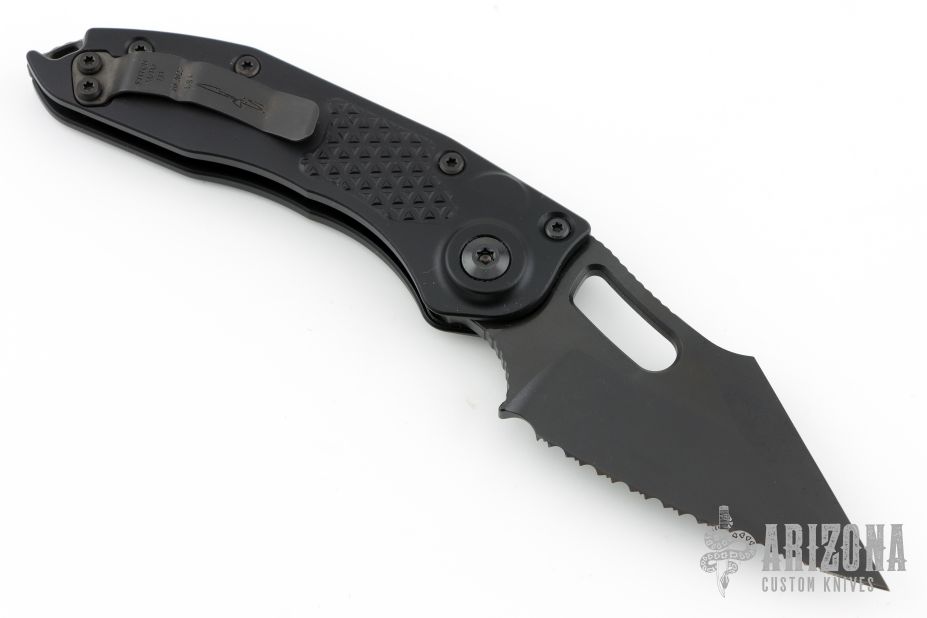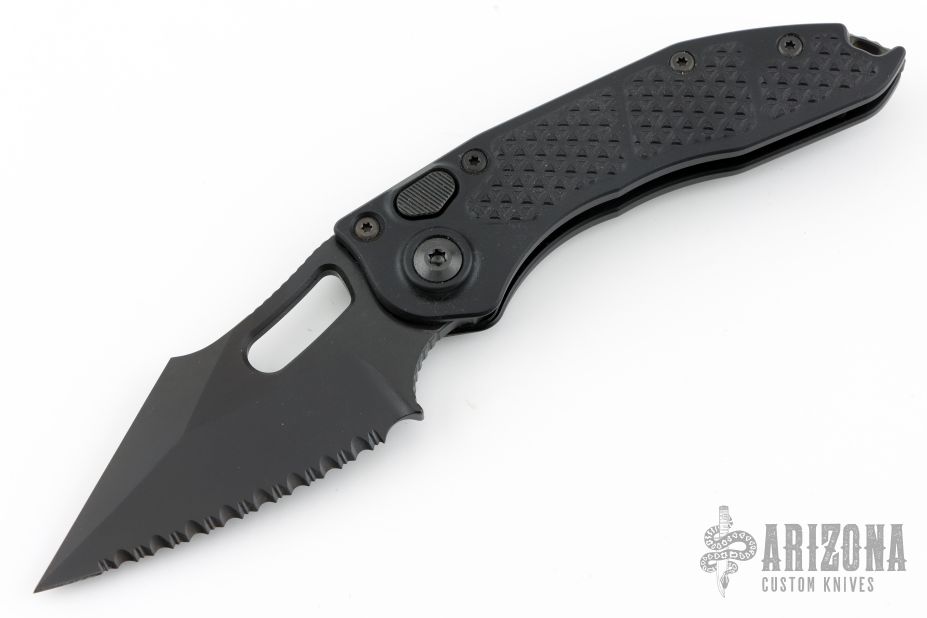 This Stitch Auto by Microtech Knives features a fully serrated DLC tumble finished blade and false top edge, notched thumb and finger rests. The handle has a black anodized and milled aluminum handle with a black backspacer, stainless steel hardware and clip, tip up carry, lanyard hole at the butt. Comes with original box and papers. S/N of 733 and dated 10/2023. Excellent condition.