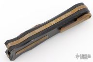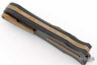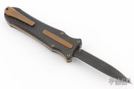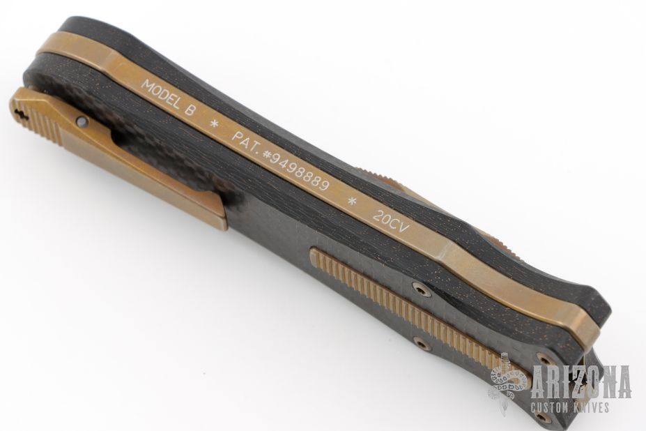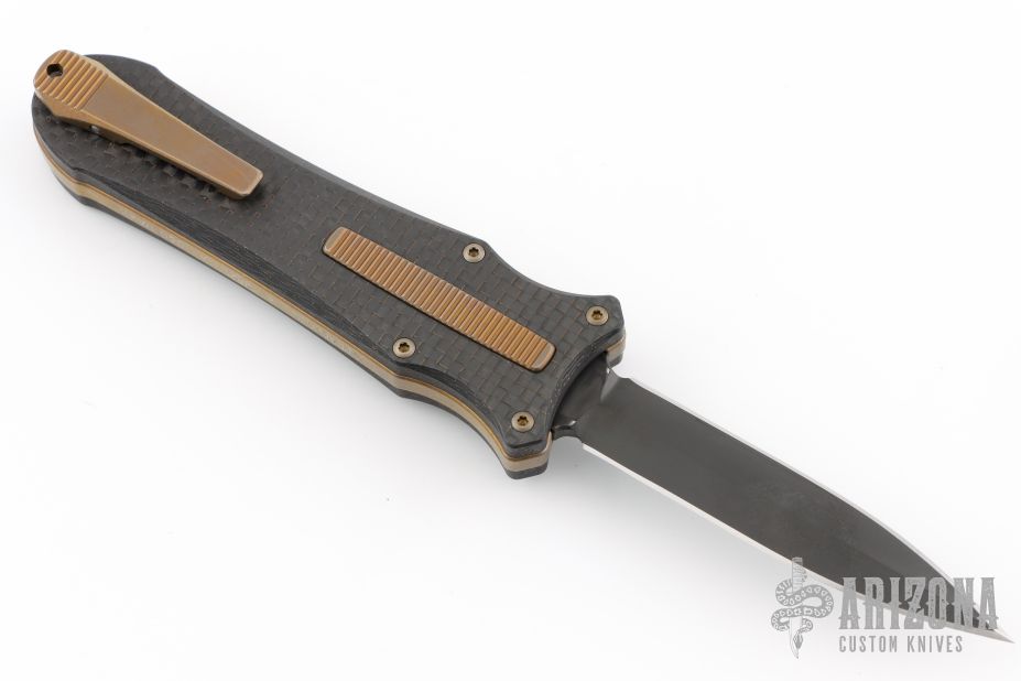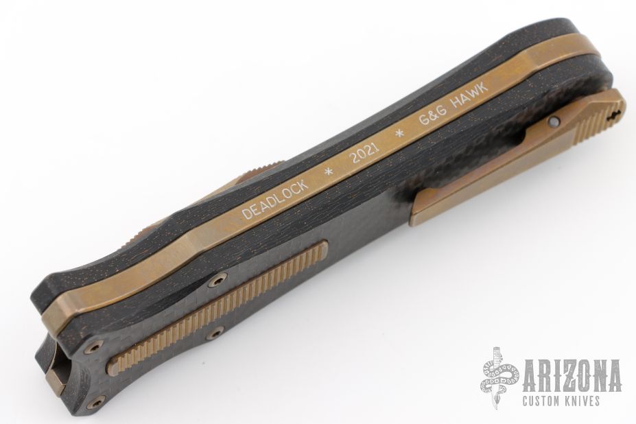 This knife is a Deadlock Model by Grant and Gavin Hawk. It has a black dagger blade. The handle has a lightning strike carbon fiber scales, anodized and tumbled titanium frame, tip down spring clip, and thumb slide. Comes with Grant and Gavin Hawk set out to create a double action OTF with no blade play.... They did it, NO blade play. Comes with maker's zipper case, tool, and lube. Has a couple light scuffs, otherwise Excellent condition.