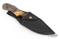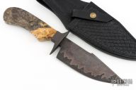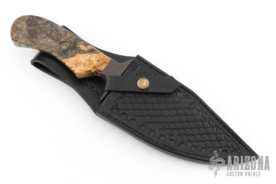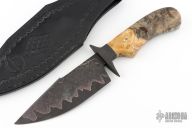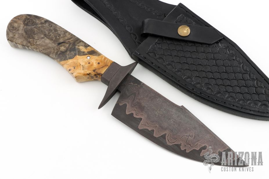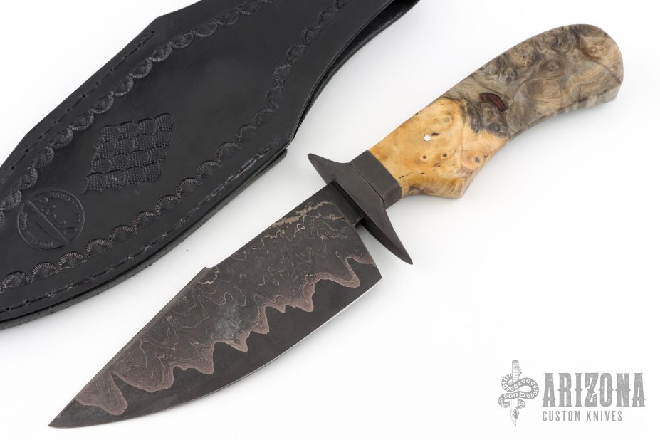 This Bowie by Abril Knives features a Meteorite San-Mai blade (1070/Meteorite) with false top edge, .203" blade stock and 2.063" blade depth, hidden tang construction. The handle has phosphotized 5260 guard, with wood grip with single pin. Comes with hand-tooled leather sheath. Excellent work. New from maker!