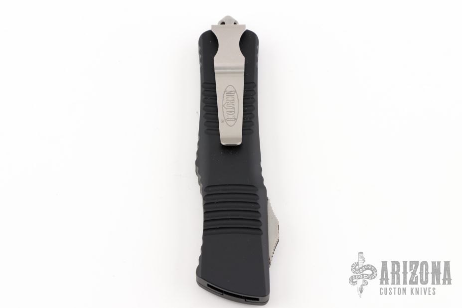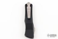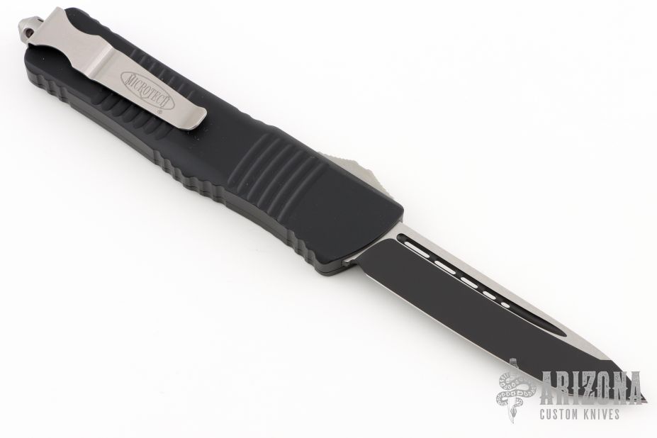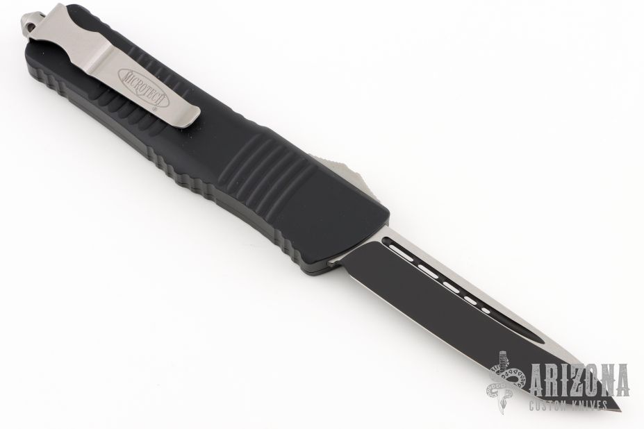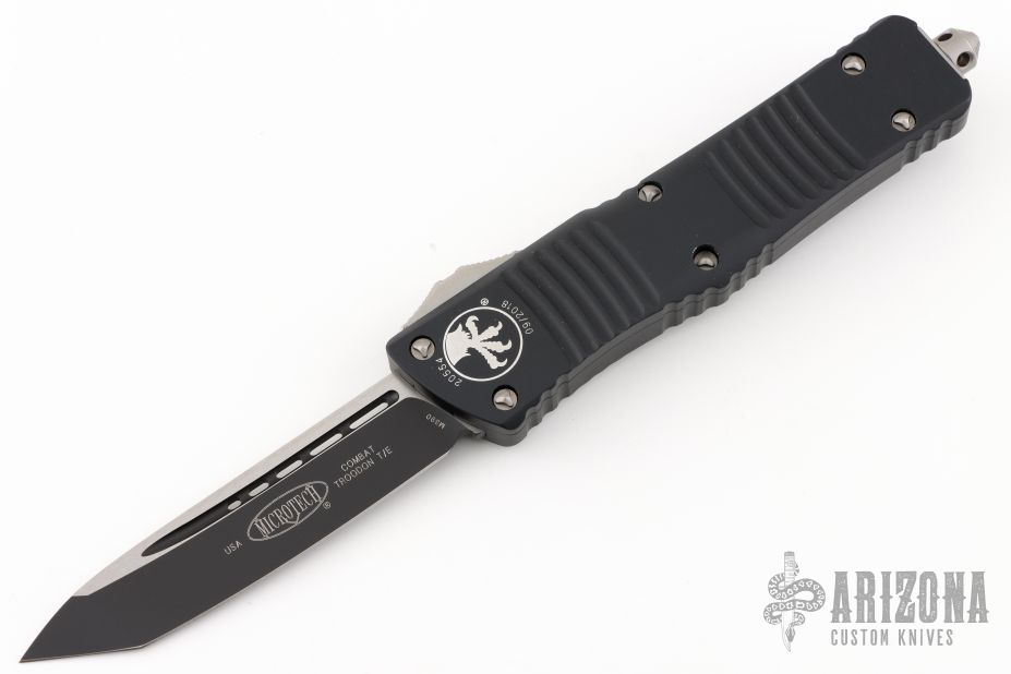 This Combat Troodon OTF automatic by Microtech knives features a black tanto blade, and a black aluminum handle with blasted hardware, tip down carry. Glass breaker. S/N 01841. Dated 02/2009. Comes with original box, and papers. Excellent condition.