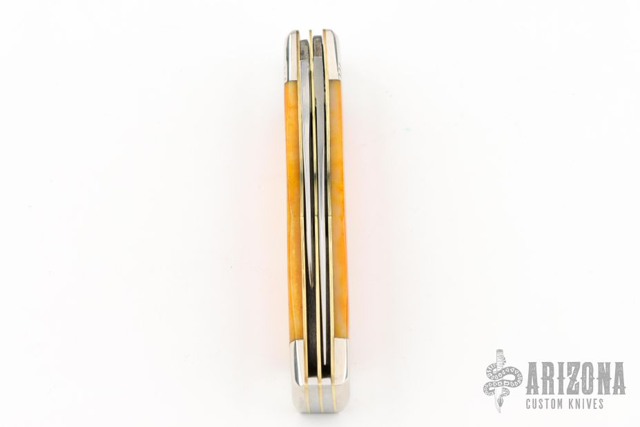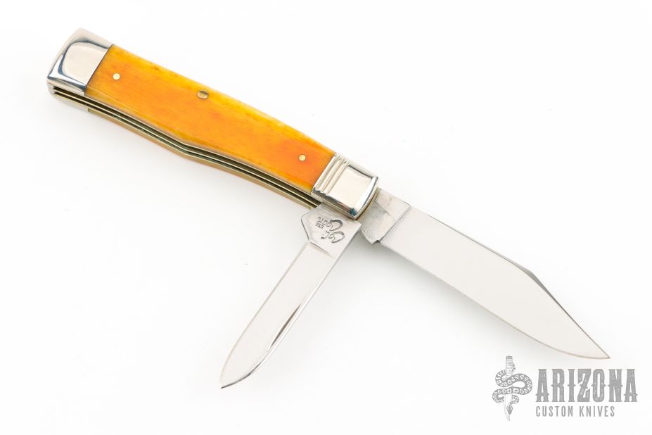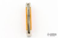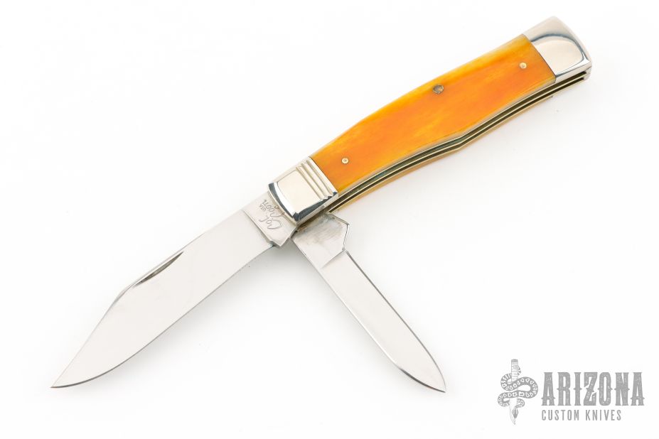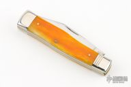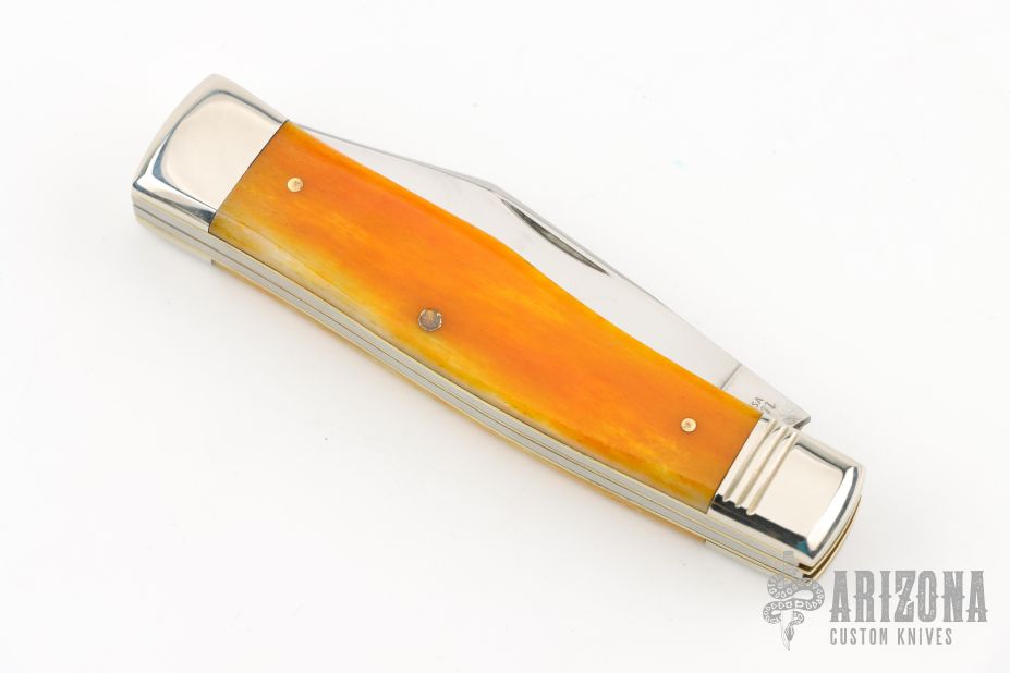 This Gun Stock by Colonel Coon features mirror finished blades with nail nicks. The handle has nickel silver bolsters, orange bone scales, brass liners, stainless steel springs. Comes with original box. Excellent condition.