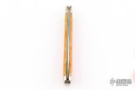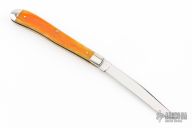 This Slimline Trapper by Colonel Coon features a mirror finished blade with nail nick. The handle has nickel silver bolsters, orange bone scales, brass liners, stainless steel springs. Comes with original box. Excellent condition.