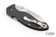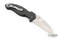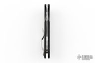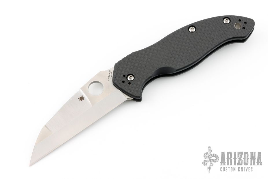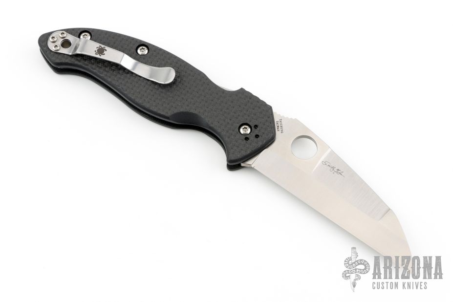 The Canis from Spyderco is a spectacle of a knife designed for everyday carry. The blade is made of CPM-S30V, and features a truly unique blade profile and grind. It has a Wharncliffe shape, a flat grind, and a ground out section which reduces weight, but full spine thickness near the tip to reinforce it. The handle is made of a carbon fiber/G-10 laminate with a gentle texture to hold it nicely in the hand.