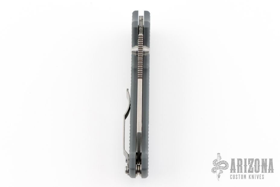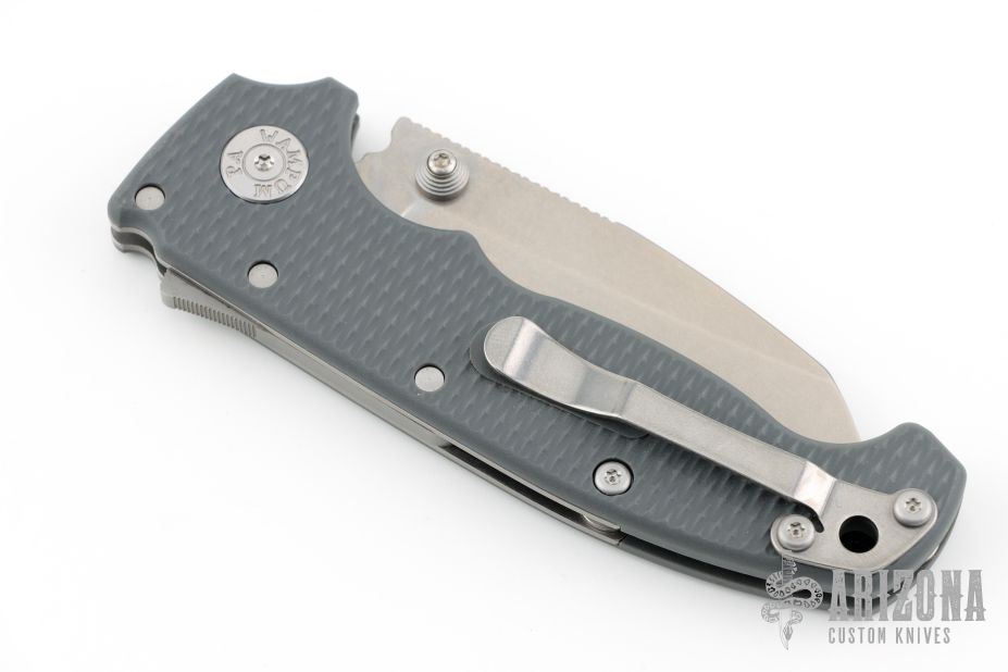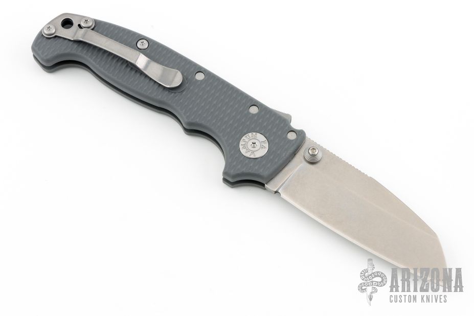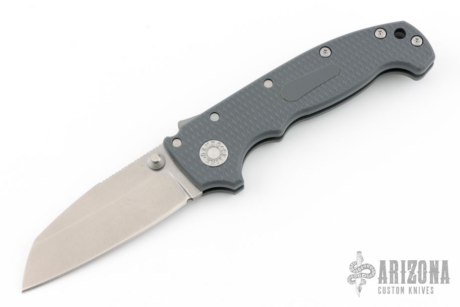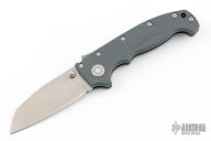 This AD20S by Andrew Demko features a stonewashed Shark Foot blade with notched thumbrest and dual thumbstuds.   The handle has a grey grivory frame with a tip up stainless steel clip and "Shark" lock release on the spine. Comes with original packaging. Excellent condition.