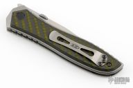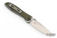 This knife by Zero Tolerance is an Emerson design. It features a two-tone blade with thumbdisc. The handle has green carbon fiber scales, stonewashed titanium frame and tip up titanium clip, left or right reversible. Comes with original box and papers. Excellent condition. s/n 4542