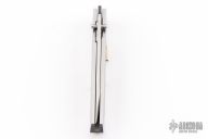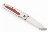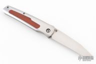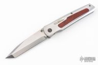 This knife by Jeff Harkins features a chisel ground tanto blade with hand rub satin finish, with dual thumbstuds. The handle features stainless steel construction with nickel silver release lever, and wood inlays. Liner lock closure. Says S.T.I on the blade, and PROTO 5/96 on the b-side of the blade. Comes in a zipper case. Has a couple light scratches, and some slight spotting/rusting on the spring. Also has a little vertical blade play. Excellent condition otherwise.
