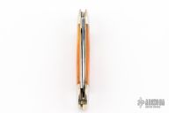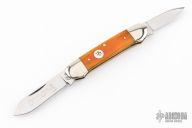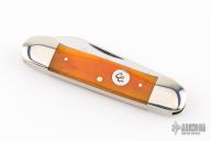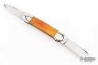 This 2-Blade Canoe by Colonel Coon features mirror finished blades with nail nicks. The handle has nickel silver bolsters, orange bone scales, brass liners, stainless steel springs. Comes with original box. Excellent condition. One of 200