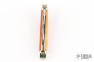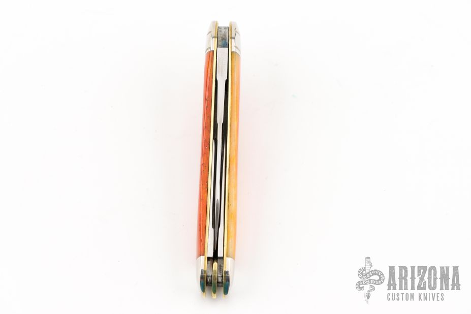 This 3-Blade Humpback Whittler by Colonel Coon features mirror finished blades with nail nicks. The handle has nickel silver bolsters, orange bone scales, brass liners, stainless steel springs. Comes with original box. Excellent condition. One of 200