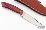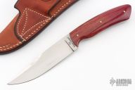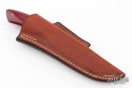 This hunter by Journeyman Smith Kent Hicks features a hand rub satin finished blade with false top edge and a hamon, .219" blade stock and 1.089" blade depth, full tang construction. The handle has purple heart wood scales with brass pins. Comes with a Rowe's Leather brown leather sheath. Has a couple very light scratches, otherwise excellent condition.