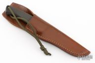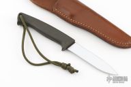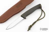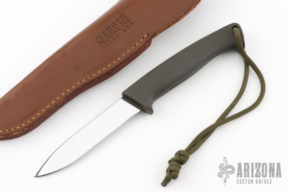 This A400 by Gerber has a satin finished high-speed tool steel/ hard chrome plated drop point blade with hidden tang, .070" blade stock, .744"  blade depth. Handle is black Armorhide with lanyard hole. Has a couple light scratches and a bare spot on the butt of the handle, otherwise excellent condition. Comes with Gerber brown leather sheath.