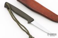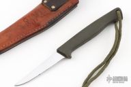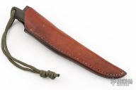 This A325 by Gerber has a satin finished high-speed tool steel/ hard chrome plated blade with hidden tang, .045" blade stock, .557"  blade depth. Handle is black Armorhide with lanyard hole. Has a couple light scratches, otherwise excellent condition. Comes with Gerber brown leather sheath.