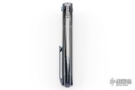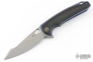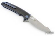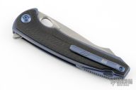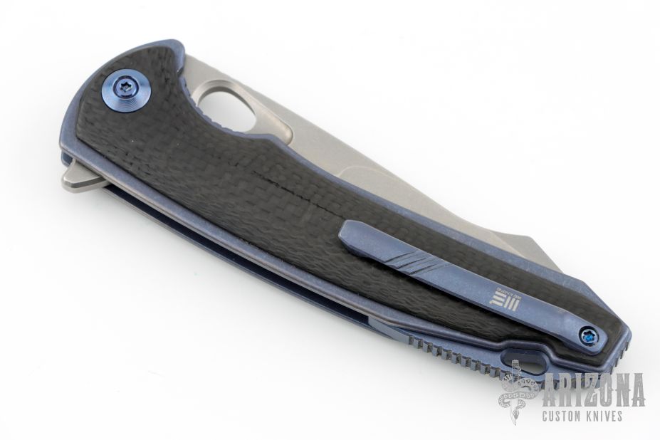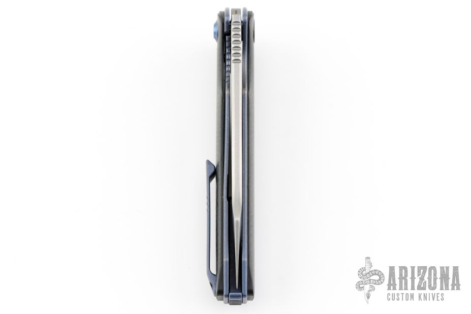 This 810A Flipper by WE Knife Company features a bead blast finished clip point blade with false top edge, notched thumbrest, thumbhole and flipper. The handle has a blue anodized titanium frame with matching anodized tip up clip and hardware. Nice detent, lockup and blade seating. Comes with original box and papers. Excellent condition.