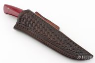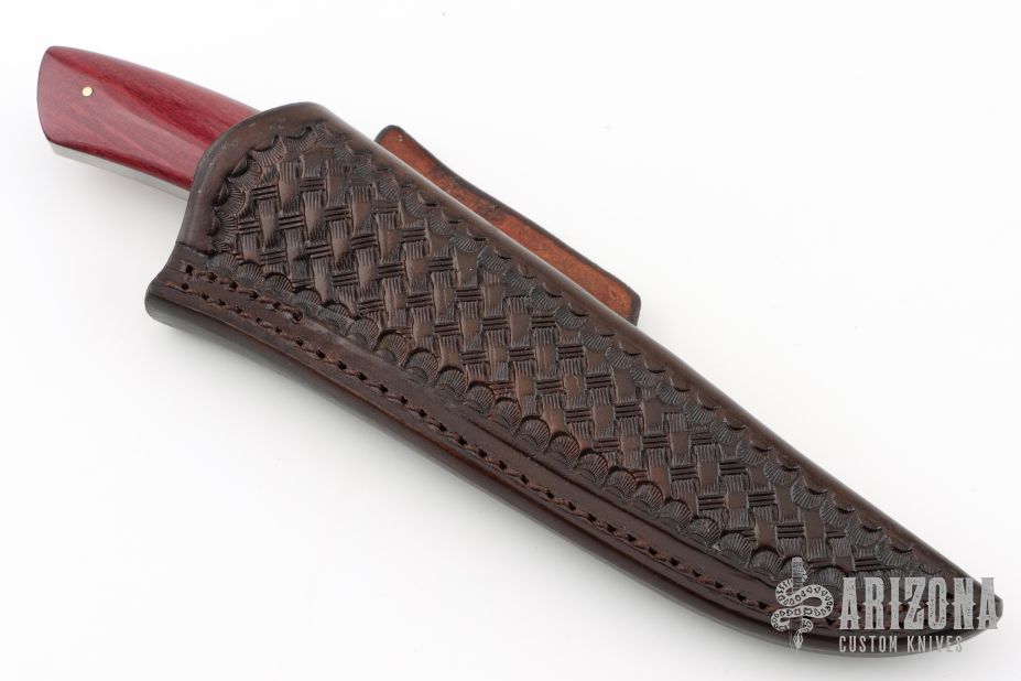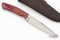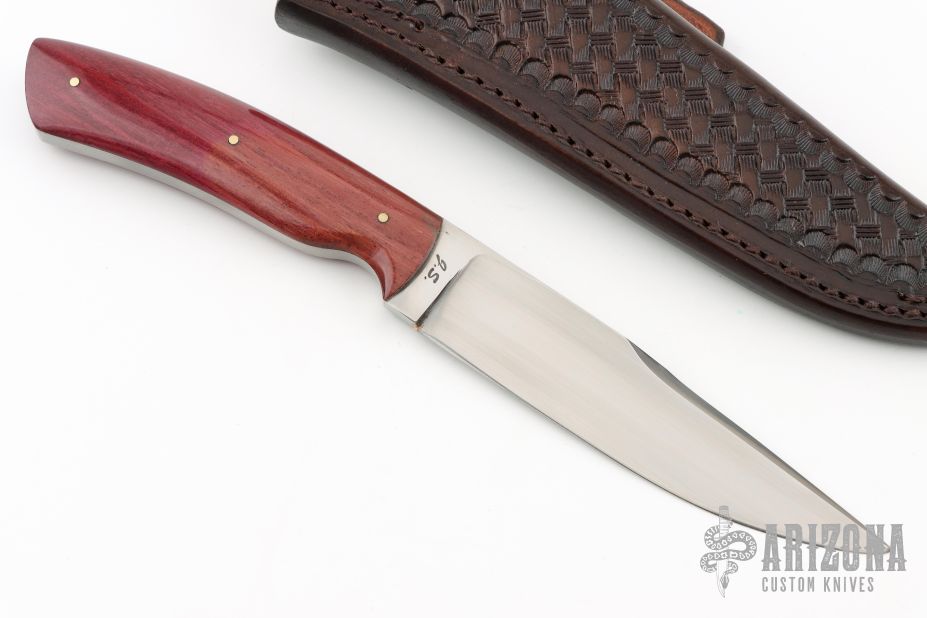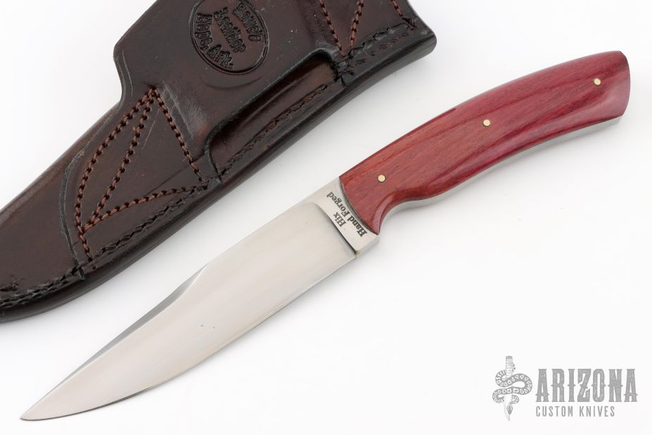 This hunter by Journeyman Smith Kent Hicks features a hand rub satin finished blade with false top edge and a hamon, .228" blade stock and 1.058" blade depth, full tang construction. The handle has purple heart wood scales with brass pins. Comes with a Rowe's Leather brown leather sheath. Has a couple very light scratches, otherwise excellent condition.