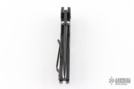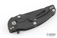 This Jurassic by Hinderer Knives features a black DLC  finished spearpoint blade with notched thumbrest and flipper. The handle has a black G-10 scale with black titanium liner and frame, tip up or down reversible matching titanium clip and filler tab. Nice detent, lockup and blade seating. Comes with original box and card. Also includes blue anodized lanyard bail, currently not attached. Excellent condition.