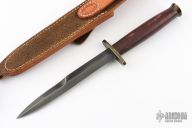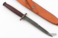 This US M3 Trench Knife by M&V Peloza features a hand rub satin finished bladed blade with sharpened top edge, .189" blade stock and .850" blade depth, hidden tang construction. The handle has an antiqued brass guard and butt with stacked leather grip. Comes with a brown leather sheath. Has a couple light scratches, otherwise excellent condition.