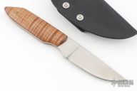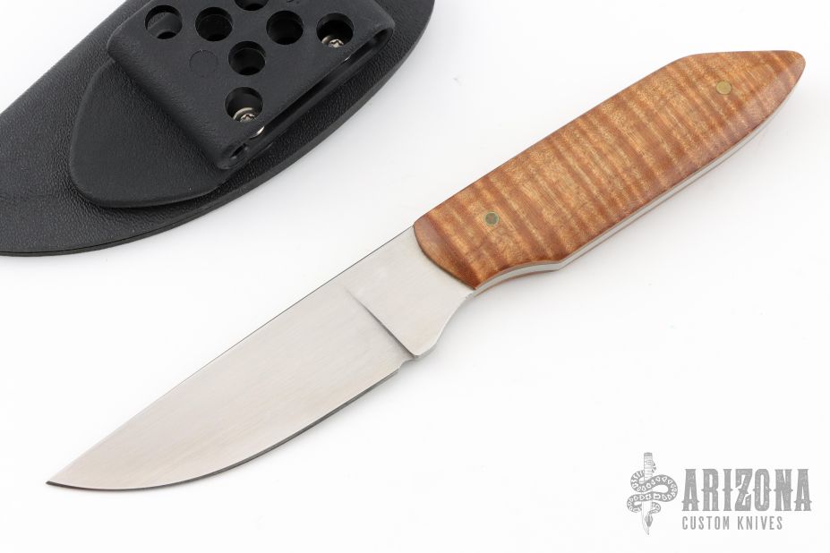 This knife by Tom Ferry features a hand rub satin finished blade with .138" blade stock and .956" blade depth, full tang construction. The handle has curly wood scales with brass pins. Comes with a kydex sheath with belt loop. Has a couple light scratches, otherwise excellent condition.