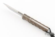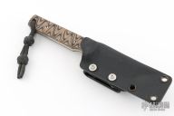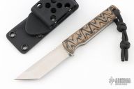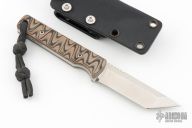 This tanto by Dirk Pinkerton features a satin finished blade with a notched thumbrest, .180" blade stock and .792" blade depth, full tang construction. The handle has black/brown G-10 scales. Comes with a kydex sheath. Has some light scratches, otherwise excellent condition.