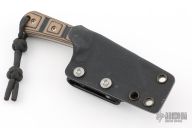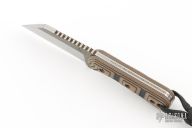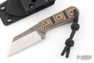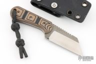 This wharncliffe by Dirk Pinkerton features a satin finished San Mai blade with a 52100 core, notched thumbrest, .153" blade stock and .999" blade depth, full tang construction. The handle has black/brown G-10 scales. Comes with a kydex sheath. Has some light scratches, and some patina on the tang, otherwise good condition.