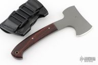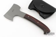 Mini axe by John Greco features a bead blast finish and .244" steel. Cocobolo scales. Black leather sheath. Excellent condition. #1