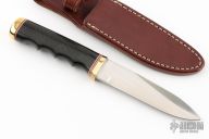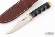 This Gambler by Randall Made Knives features a satin finished blade with .236" blade stock and 1.059" blade depth, hidden tang construction. Sharpened top edge. Notched thumbrest. Black linen micarta grip with finger grooves, brass guard and butt, red/white/blue spacers. The Gambler is one of Randall's non-catalog knives. Comes with a brown leather sheath. Excellent condition.