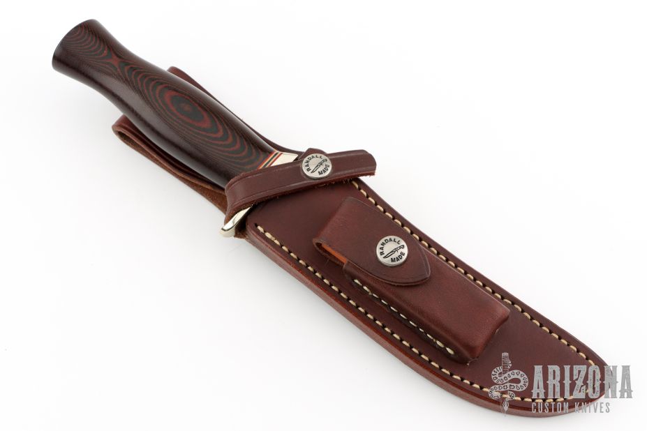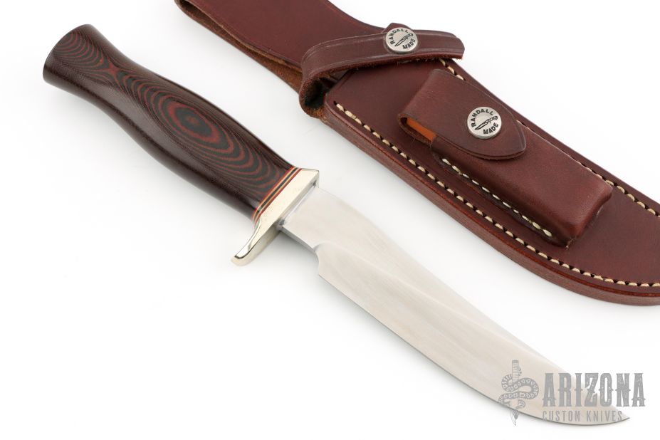 This model 3-6 from Randall Made Knives has an upswept satin finished blade with notched thumbrest, .218" blade stock and 1.211" blade depth, hidden tang construction. The handle has a nickel silver guard, black/red linen micarta handle, red/white/blue spacers. Includes brown leather sheath with stone. Excellent Condition.