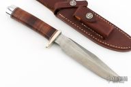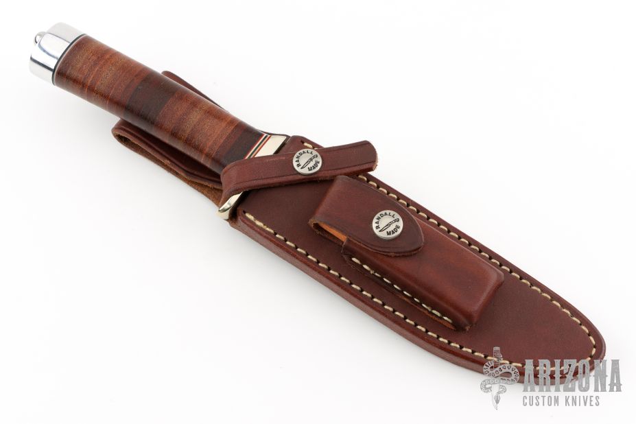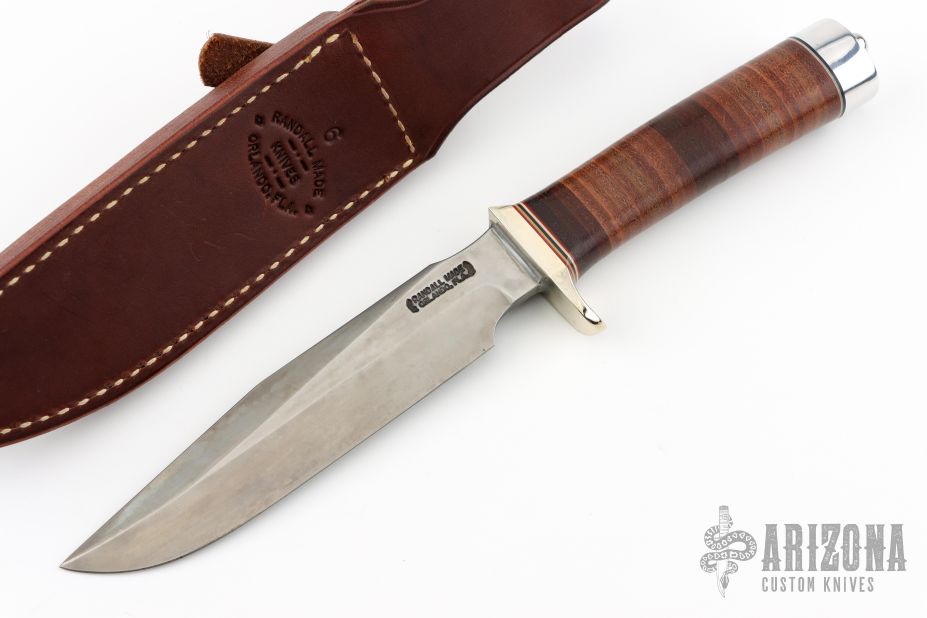 The Model 1 Fighter by Randall Made Knives has a satin finished blade with sharpened top edge, .213" blade stock and 1.267" blade depth, hidden tang construction. The handle has a nickel silver guard, stacked leather handle with red/white/blue spacers, duralumin butt. Comes with a brown leather sheath. Has some light patina, otherwise excellent condition.