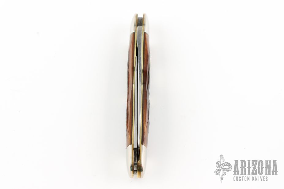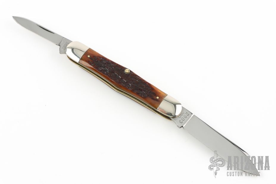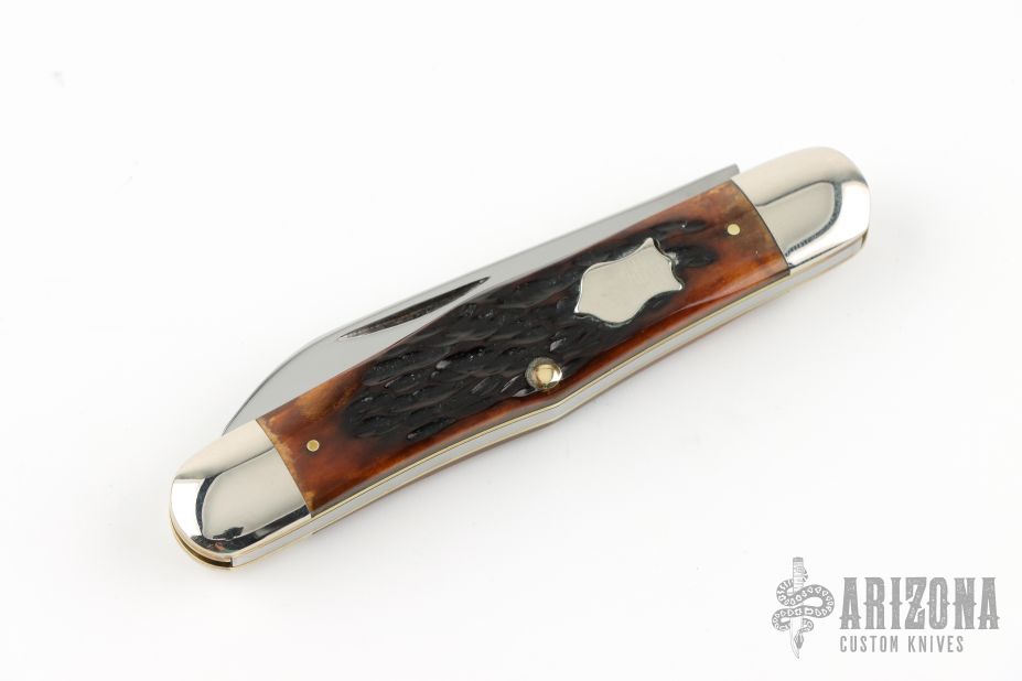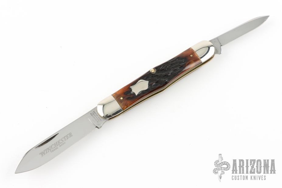 This Winchester folder features two mirror polished blades. Nickel Silver front and rear bolsters with jigged bone covers. Brass liners and steel springs. Original box. Has some light scratches, great condition otherwise.