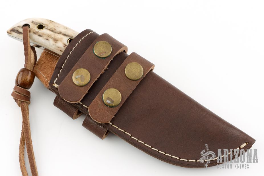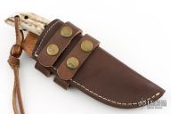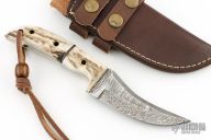 This Skinner by P&C Custom Knives features a Damascus blade with false top edge, .208" blade stock and 1.404" blade depth, full tang construction. The handle has stag scales with a wood spacer, brass tube pins, fileworked tang. Comes with a brown leather sheath. Comes with makers card. Excellent condition.