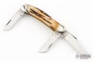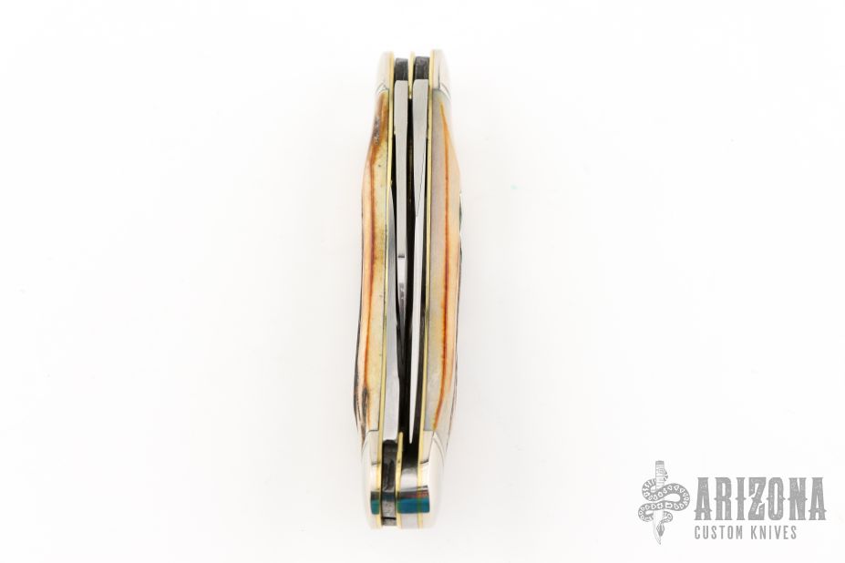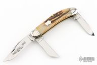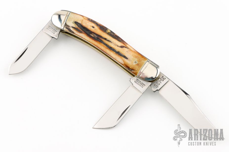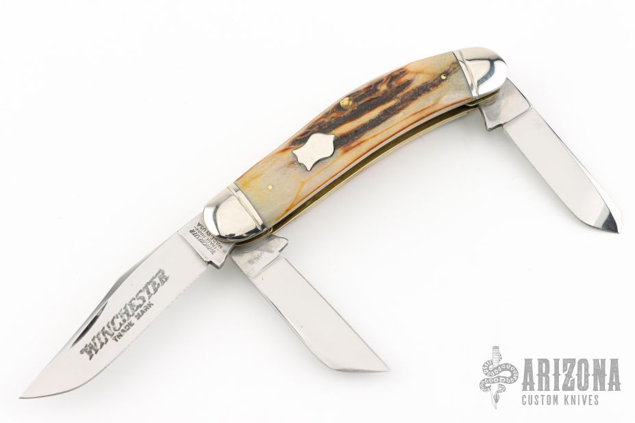 This Winchester folder features three mirror polished blades. Nickel Silver front and rear bolsters with very nice stag covers. Brass liners and steel springs. Original box. Has some light scratches, great condition otherwise.