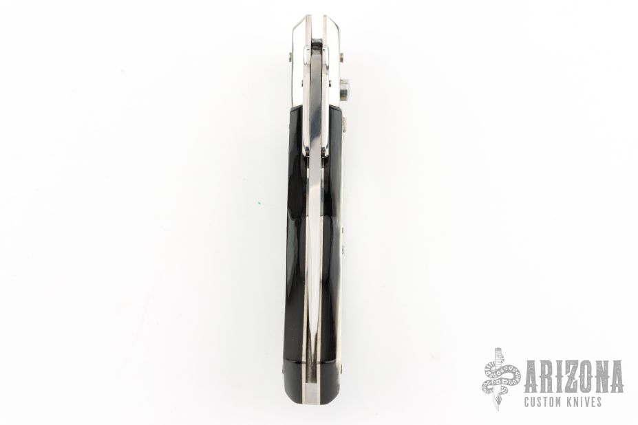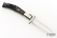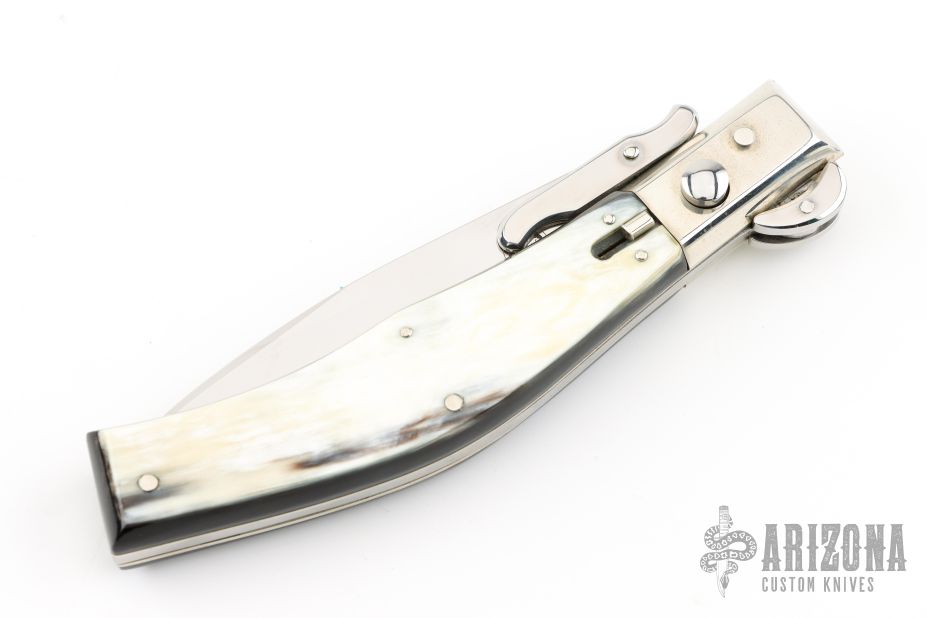 This auto by AGA Campolin (Lepre) feature a mirror polished blade. The handle has nickel silver bolsters, buffalo horn scales, safety, nickel silver liners, stainless steel backspacer. Includes a zippered. Excellent condition.