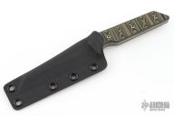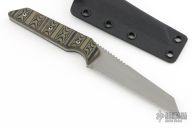 This wharncliffe by Dirk Pinkerton features a bead blast finished blade with a notched thumbrest, .169" blade stock and .944" blade depth, full tang construction. The handle has black/green G-10 scales. Comes with a kydex sheath. Excellent condition.